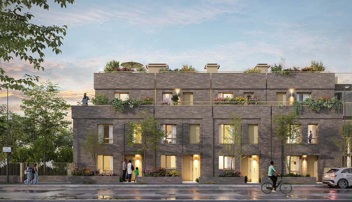 Conçus tels des maisons de ville mitoyennes, les duplex situés au rez de chaussée disposent chacun de leur accès individualisé depuis la rue, ainsi que d’un jardin privatif à l’intimité préservée à l’arrière, tandis que les logements situés en attique desservis par une coursive profitent de généreuses terrasses.